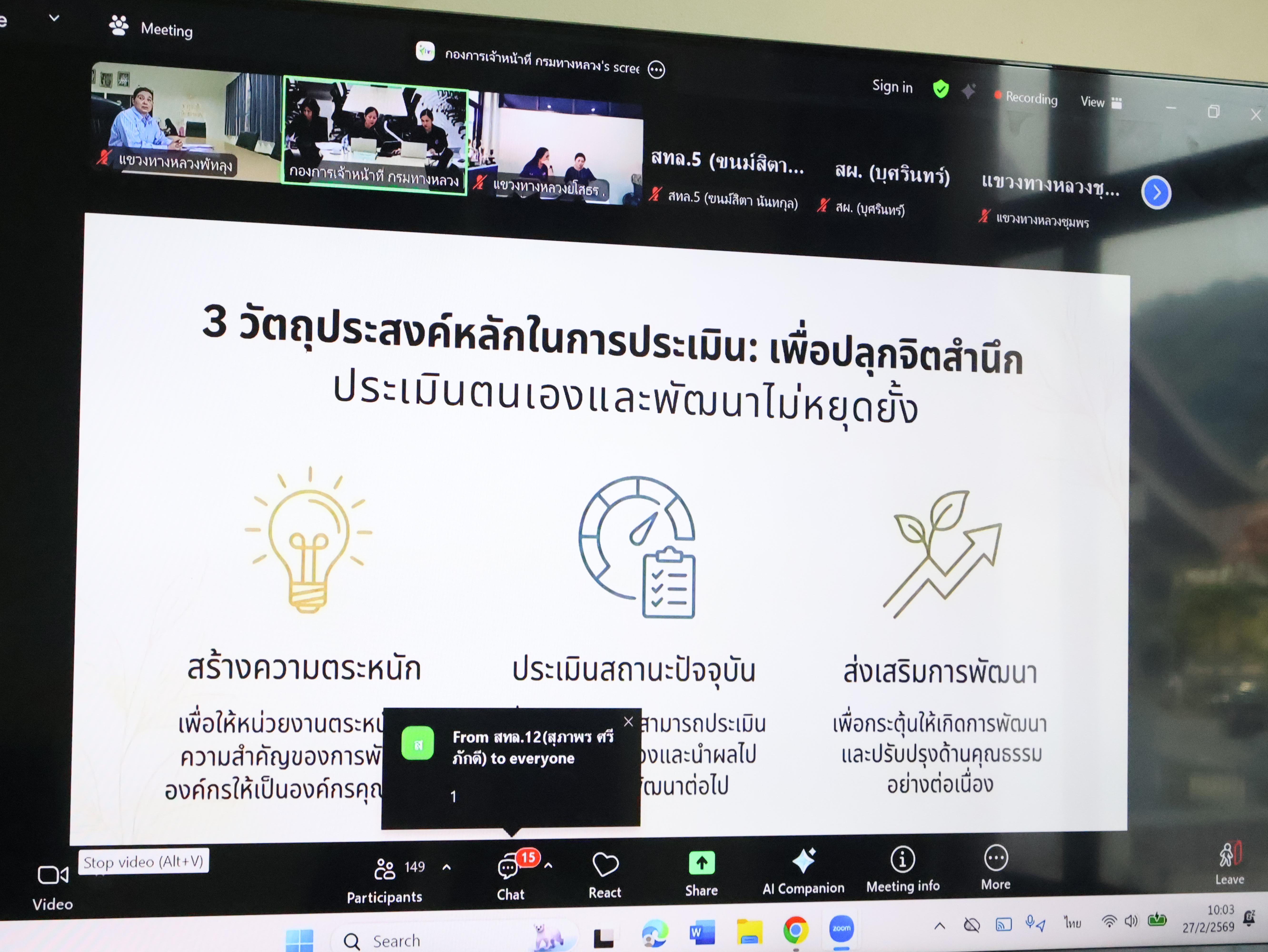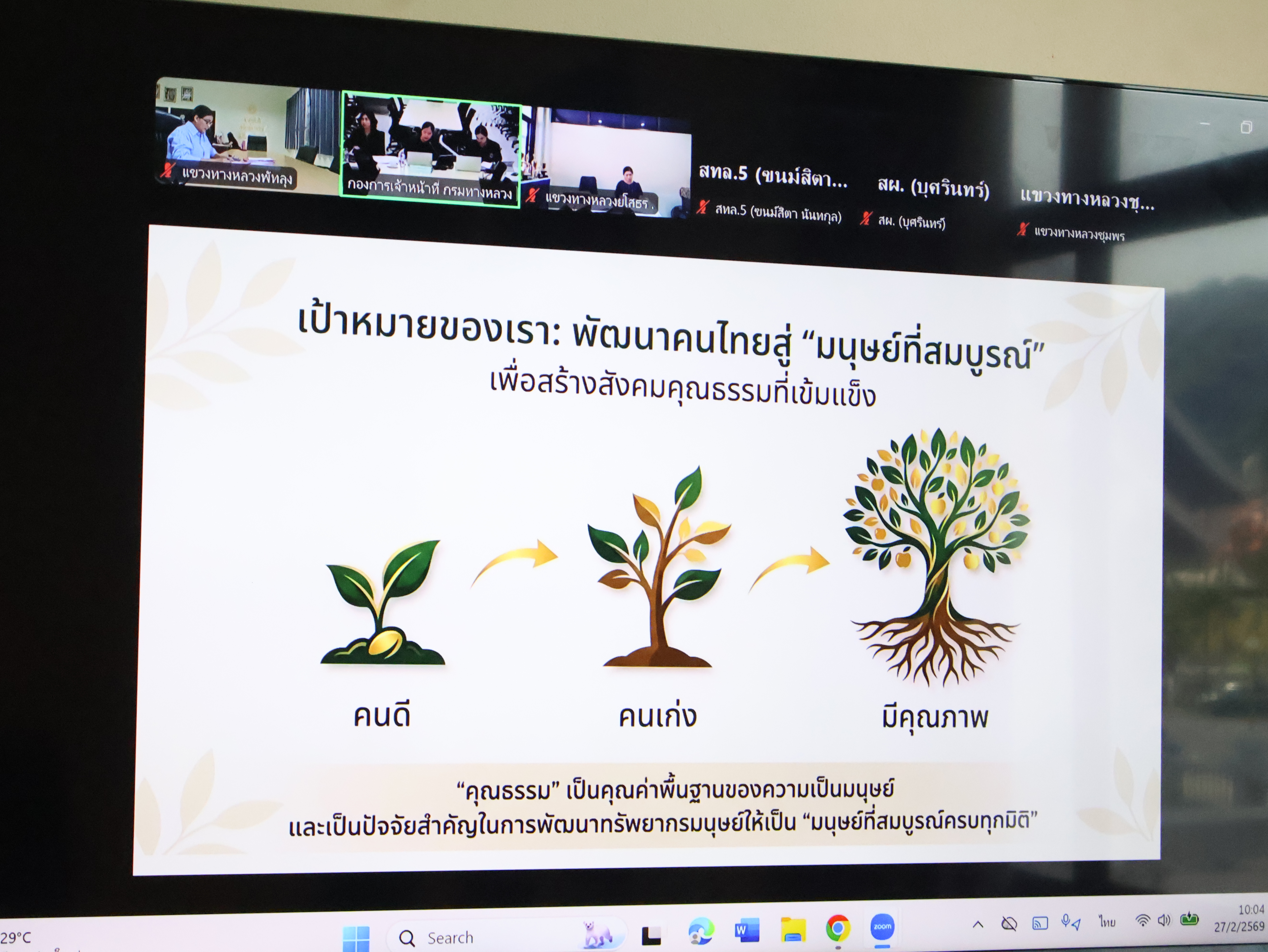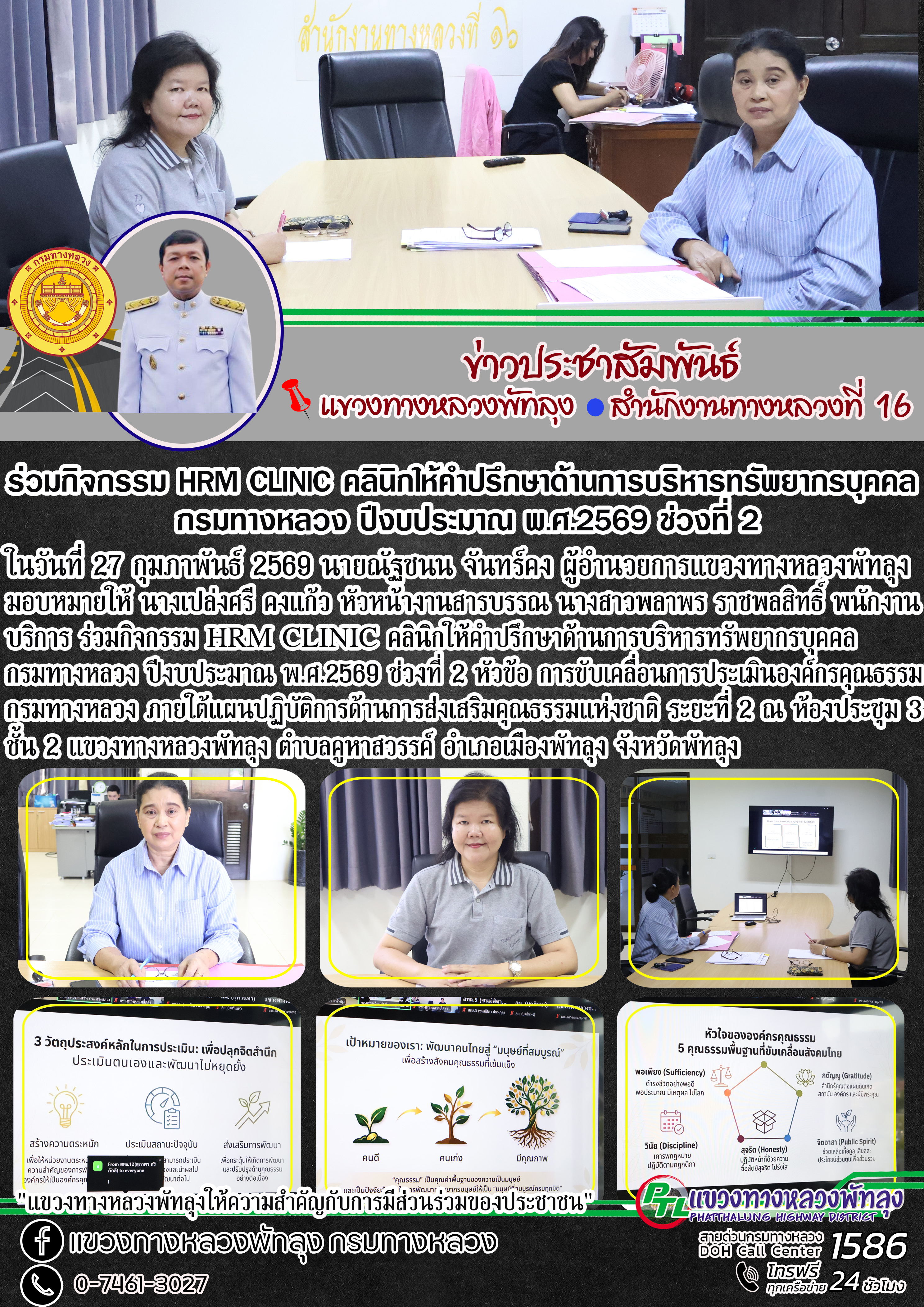 ในวันที่ 27 กุมภาพันธ์ 2569 นายณัฐชนน จันทร์คง ผู้อำนวยการแขวงทางหลวงพัทลุง มอบหมายให้ นางเปล่งศรี คงแก้ว หัวหน้างานสารบรรณ นางสาวพลาพร ราชพลสิทธิ์ พนักงานบริการ ร่วมกิจกรรม HRM CLINIC คลินิกให้คำปรึกษาด้านการบริหารทรัพยากรบุคคล กรมทางหลวง ปีงบประมาณ พ.ศ.2569 ช่วงที่ 2 หัวข้อ การขับเคลื่อนการประเมินองค์กรคุณธรรม กรมทางหลวง ภายใต้แผนปฏิบัติการด้านการส่งเสริมคุณธรรมแห่งชาติ ระยะที่ 2