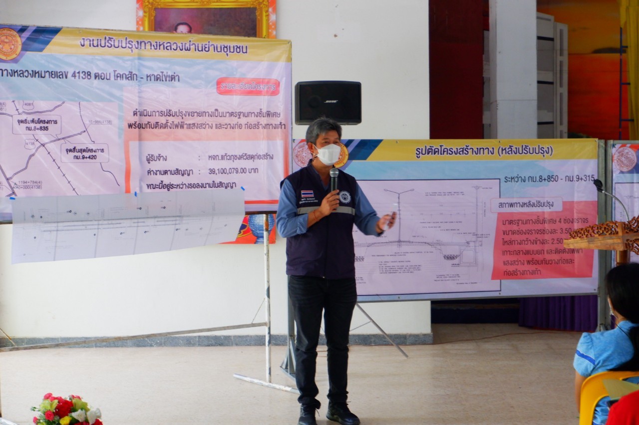 ทางหลวงหมายเลข 4138 ตอน โคกสัก - หาดไข่เต่า ระหว่าง กม.8+835 - กม.9+420 เพื่อแนะนำข้อมูล และรูปแบบการก่อสร้างให้ประชาชน ในพื้นที่ได้รับทราบ พร้อมทั้งรับฟังข้อเสนอแนะต่างๆ