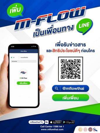 ข้อมูลข่าว : สมัครใช้บริการ M-FLOW ง่าย ๆ เพียง 2 นาที ผ่าน Line OA. เพิ่มเพื่อน @mflowthai หรือ สแกน QR Code แล้วผูกกับบัตรเครดิต